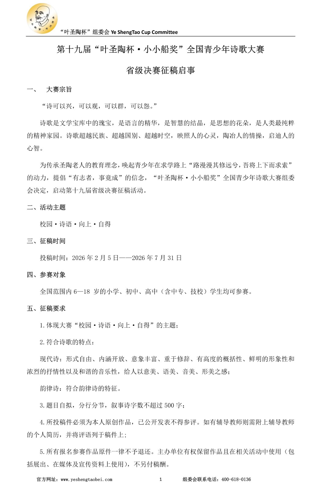 第十九届“叶圣陶杯·小小船奖”全国青少年诗歌大赛省级决赛征稿启事/征稿启事/叶圣陶杯系列赛事官网