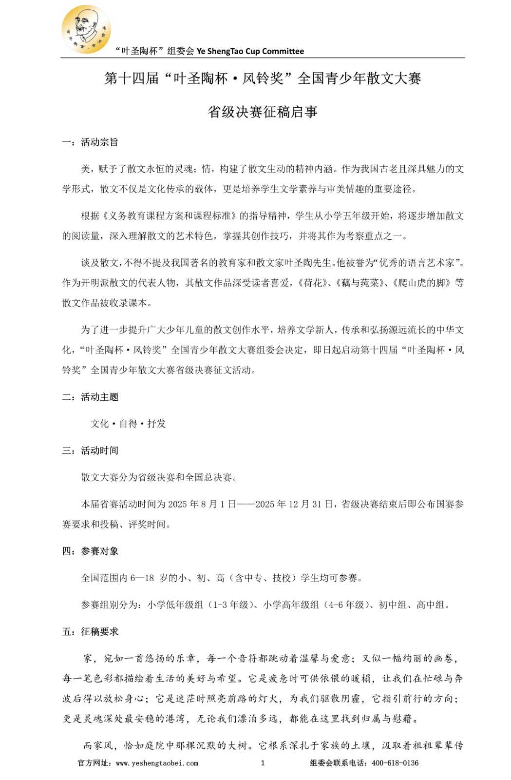 第十四届“叶圣陶杯·风铃奖”全国青少年散文大赛省级决赛征稿启事/征稿启事/叶圣陶杯系列赛事官网