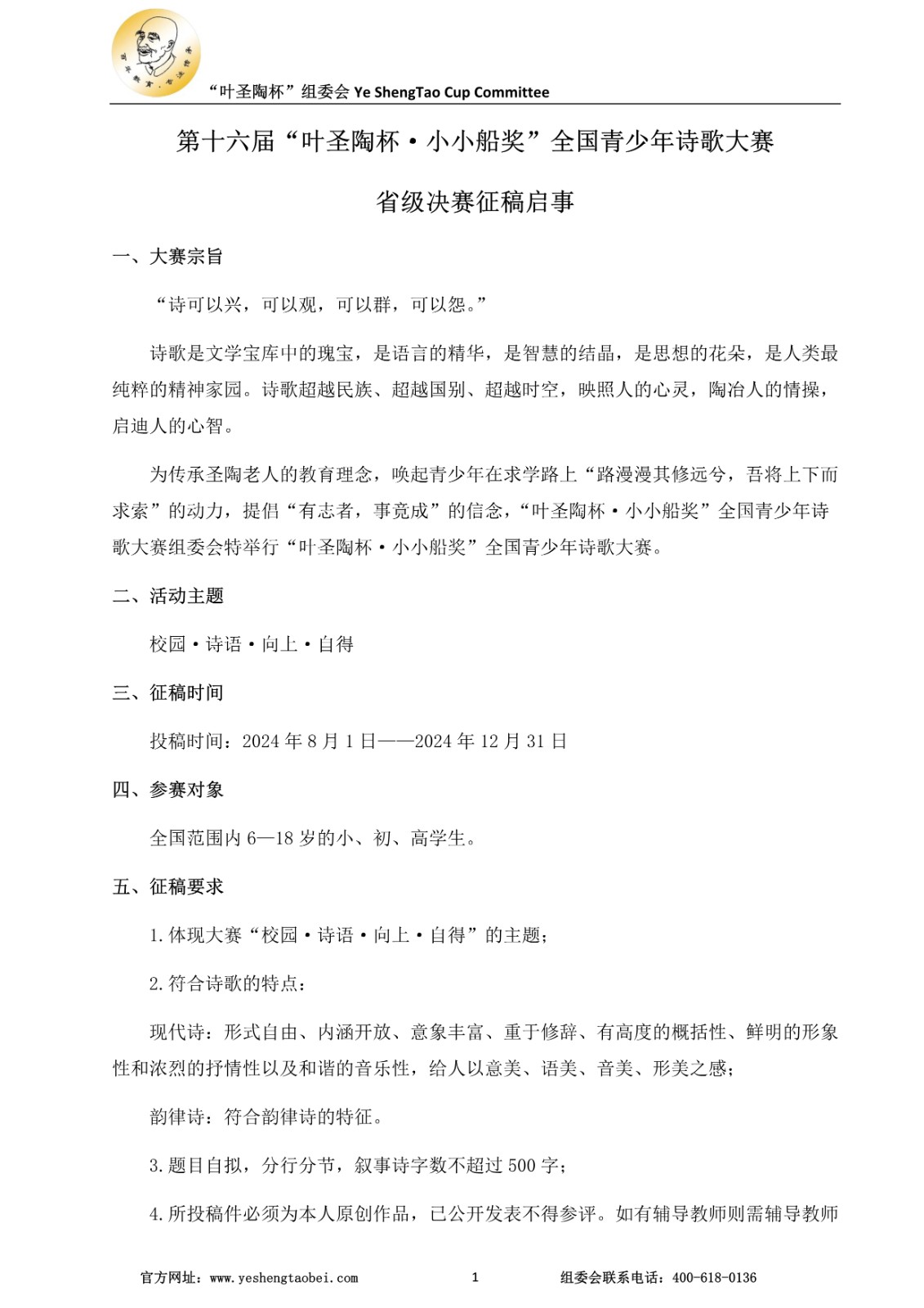 第十六届“叶圣陶杯·小小船奖”全国青少年诗歌大赛征稿启事/征稿启事/叶圣陶杯系列赛事官网