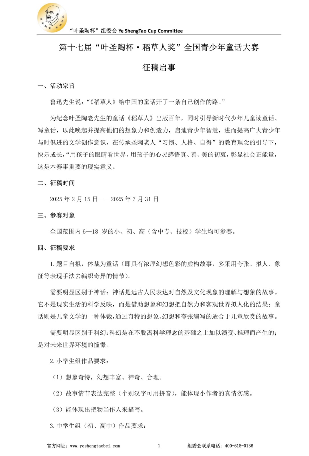 第十七届“叶圣陶杯·稻草人奖”全国青少年童话大赛征稿启事/征稿启事/叶圣陶杯系列赛事官网